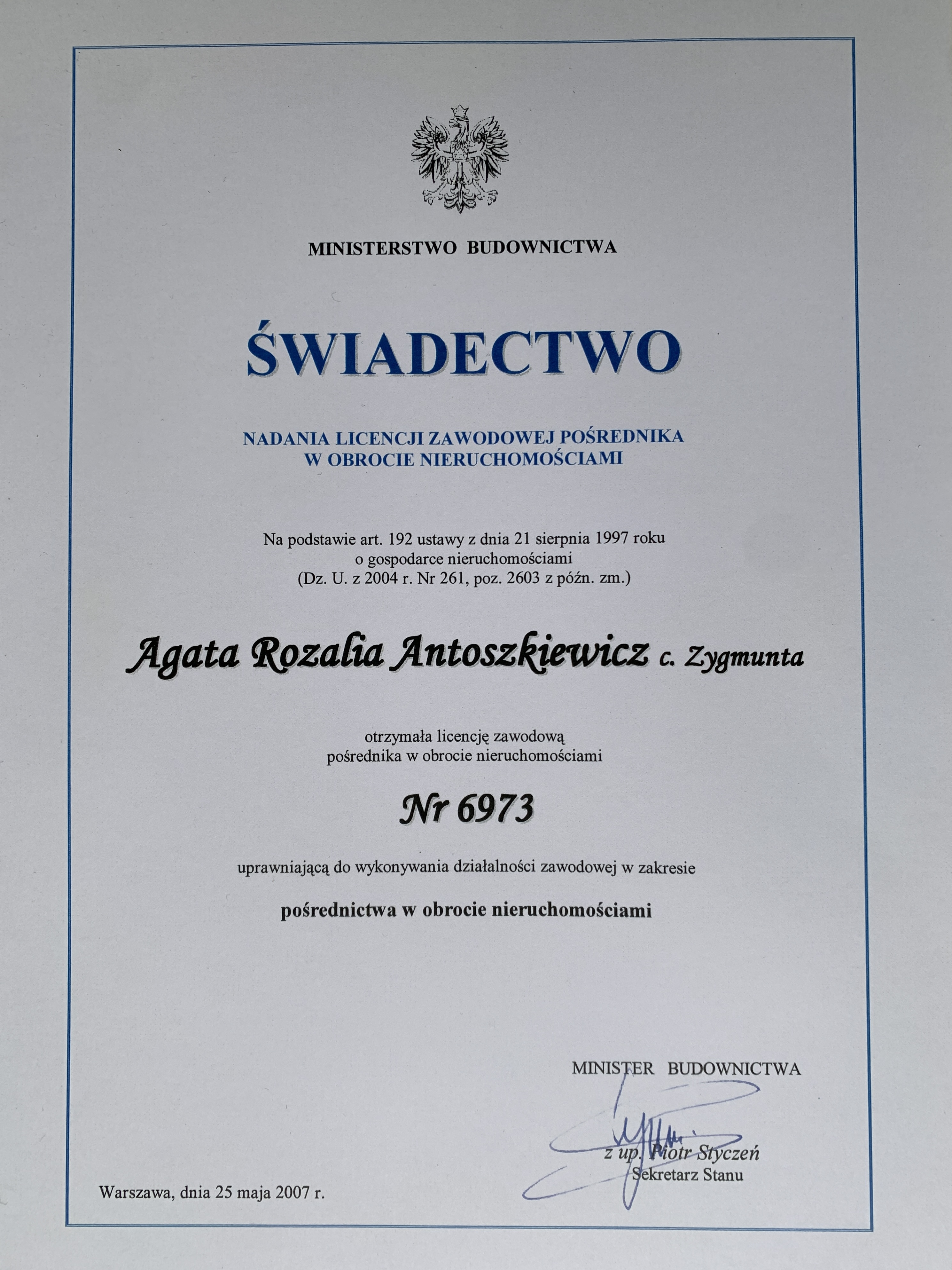 Biuro prowadzone jest przez osobę posiadającą licencję zawodową pośrednika w obrocie nieruchomościami nr. 6973 nadaną przez Ministra Budownictwa oraz posiadającą wykształcenie wyższe ekonomiczne, pracującą w nieruchomościach od roku 2001 co jest kluczowym elementem znajomości rynku lokalnego. Sporządzamy pełną dokumentację, pomagamy we wszystkich formalnościach. Przy obsłudze transakcji na rynku nieruchomości współpracujemy z innymi specjalistami takimi jak: agencjami nieruchomości, rzeczoznawcami, geodetami, administratorami i zarządcami, kancelariami notarialnymi, kancelariami prawnymi, architektami oraz bankami. Współpracujemy z Doradcami Finansowymi z największych Banków w Polsce w celu zapewnienia Państwu wygody podczas formalności związanych z kredytowaniem. Pomagamy w zorganizowaniu Świadectwa Charakterystyki Energetycznej.