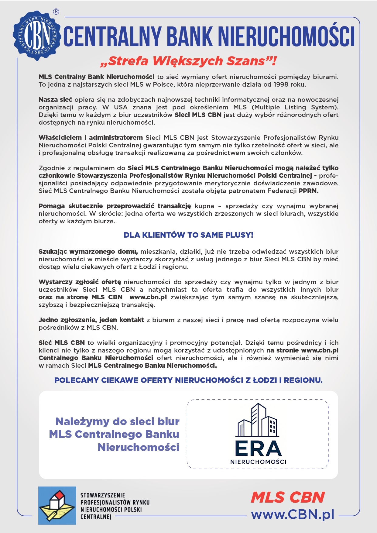 Biuro ERA Nieruchomości jest uczestnikiem sieci wymiany ofert CBN – Centralny Bank Nieruchomości, dzięki czemu szukając wymarzonego domu, mieszkania, działki czy lokalu już nie muszą Państwo odwiedzać wszystkich firm. Wchodząc do jednego z naszych z biur mają Państwo dostęp do ofert nieruchomości zgłoszonych zarówno na naszej firmie, jak i w biurach z nami współpracujących. Również zgłaszając ofertę nieruchomości do najmu, sprzedaży na wyłączność w naszym biurze natychmiast zgłaszasz tę ofertę do wszystkich innych biur uczestników Sieci ( system MLS) wymiany ofert: