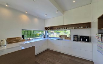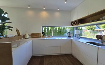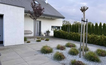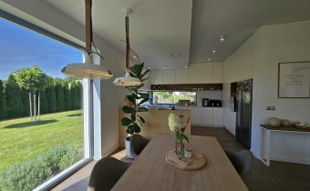 Dom energooszczędny, niemal samobsługowy, tani w utrzymaniu. Ogrzewanie na pellet, panele fotowoltaiczne, oczyszczalnia przydomowa, woda miejska. Okna aluminiowe.