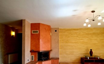 Ściany wewnątrz domu w zależności od charakteru przestrzeni wykończone zostały trawertynem, tynkiem egipskim, stiukiem, farbą dekoracyjną i klasyczną gładzią.