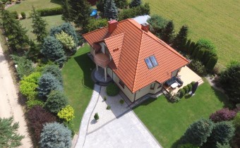 Dach pokryty jest dachówką ceramiczną w kolorze cegły.