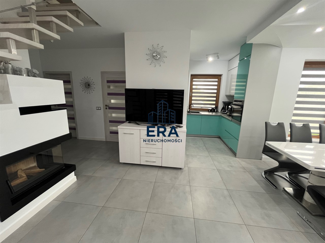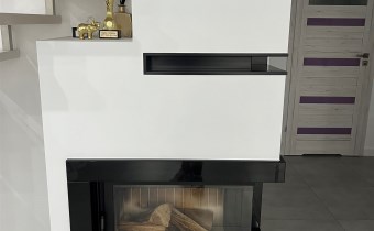 Ogrzewany pompą ciepła z odwiertami i fotowoltaiką, dodatkowo kominek. Budowany w 2017r.