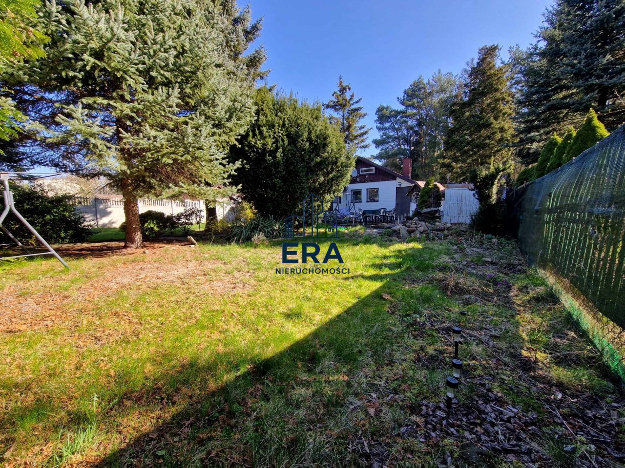 Działka całkowicie ogrodzona w kształcie prostokąta z licznymi nasadzeniami.