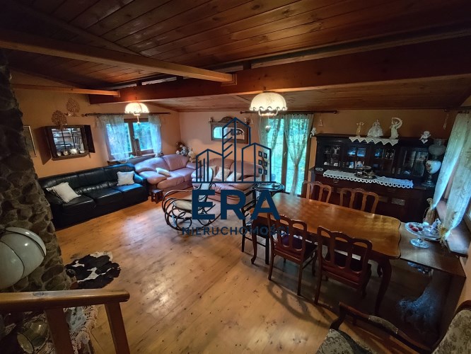 Dom posiada przestronny, klimatyczny salon z kominkiem, którego kamienna obudowa nadaje wnętrzu przytulny, góralsko-letniskowy charakter. Drewniane sufity i podłogi tworzą wyjątkowy nastrój, a liczne okna zapewniają naturalne oświetlenie oraz widok na otaczającą zieleń.