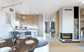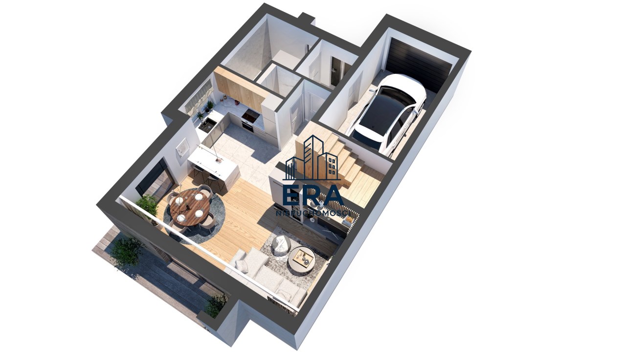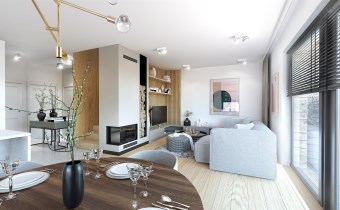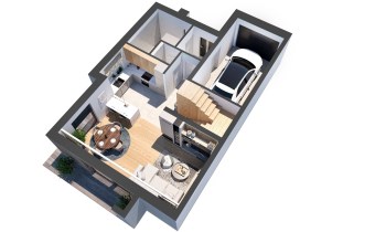 W jego skład wchodzi: PARTER: -salon z kominkiem,jadalnią i otwartą kuchnią, -hol,toaleta,kotłownia,garaż. PIĘTRO: -trzy sypialnie ( w tym dwie z balkonem) -łazienka,garderoba,przedpokój.
