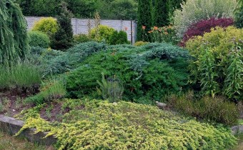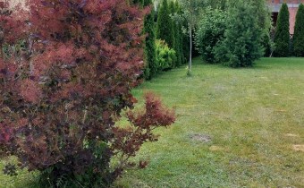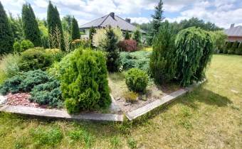 Działka obsadzona licznymi drzewami, krzewami.