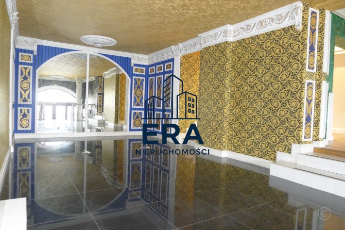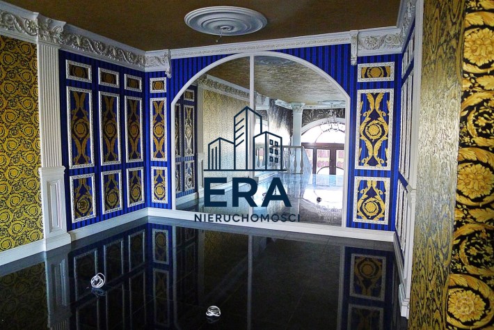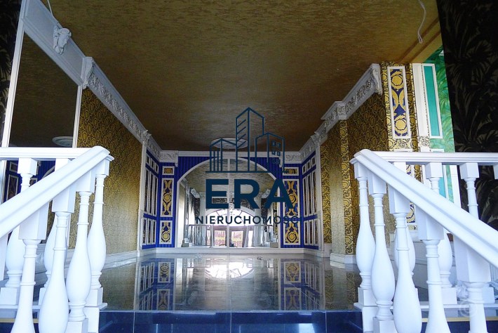 Imponujący hall ( ok.46 m2 ) z centralnie umieszczonymi schodami prowadzi do otwartego, szerokiego pomieszczenia, zakończonego ścianą luster. Pokój będący przedłużeniem hallu, widziany od wejścia, przypomina przestronny „balkon” z pięknymi balustradami stanowiącymi poręcze schodów.