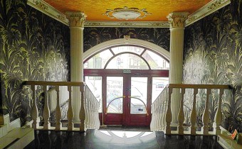 Na podłogach hallu i pomieszczenia przechodniego gres polerowany w ciemnym kolorze. Na ścianach tapeta w geometryczne i kwiatowe motywy, w harmonijnej kolorystyce. Sufity zdobione stiukami oraz sztukaterią podsufitową. Symetrycznie, po bokach poręczy dwie greckie kolumny „podpierające” sufit oraz ozdobna waza w stylu klasycznym, umieszczona na cokole.