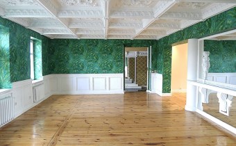 Na podłodze dużego pokoju drewniane, lakierowane deski w bardzo dobrym stanie. Na ścianach- tapety, w części dolnej ścian-stiuki gipsowe. Na suficie-sztukateria. W części bocznej, oddzielającej pokój „konferencyjny” od najmniejszego pomieszczenia, duże lustro z parapetem, ozdobione figurami w stylu klasycznym. Trzy okna doświetlają pomieszczenie nadając mu ciekawy charakter.