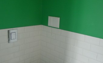 Z „biura” przejście do toalety, wyposażonej w podstawowe sanitariaty": WC, umywalka z szafką. Na podłodze terakota, ściany glazura.