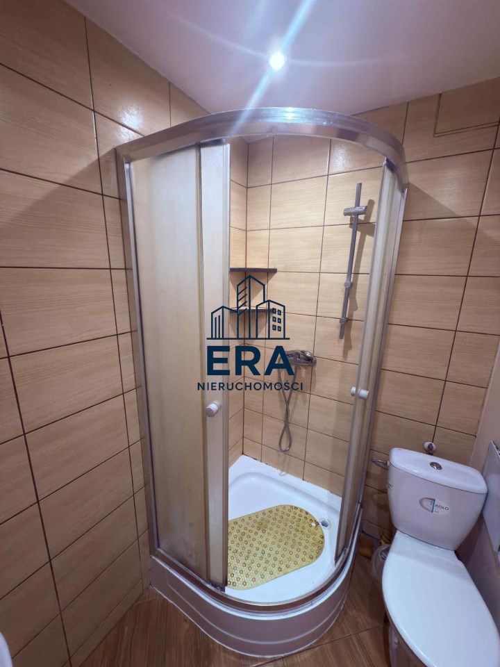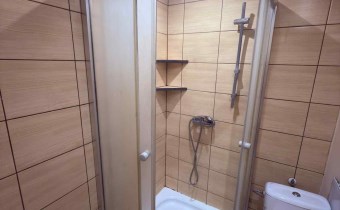 Wyposażenie łazienki kabina prysznicowa, lustro, pralka, umywalka, WC