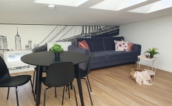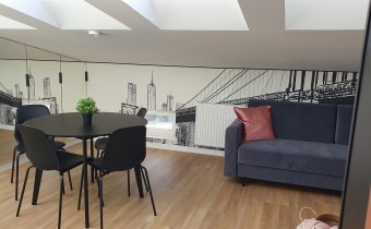 Salon wyposażony w wygodną sofę z funkcją spania, kącik telewizyjny oraz stół i krzesła. Przestrzeń pod skosami została zagospodarowana na pojemne szafki pod wymiar z lustrzanymi frontami, co dodatkowo optycznie znacznie powiększa przestrzeń. W przedpokoju również zamontowane zostały pojemne szafy pod wymiar.