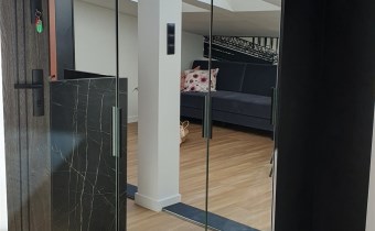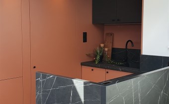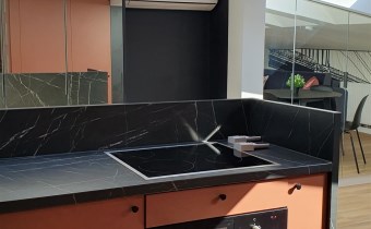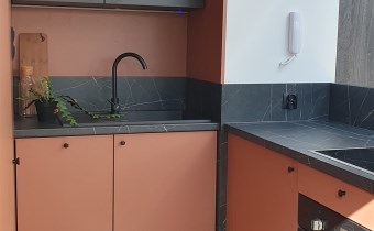 Kuchnia w zabudowie pod wymiar w pełni wyposażona w sprzęt AGD: zmywarka, płyta indukcyjna, lodówka, zamrażarka, piekarnik. Meble kuchenne wyposażone w system Blum, który odpowiada za ciche i delikatne zamykanie frontów, niezależnie od obciążenia.