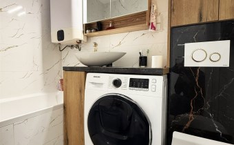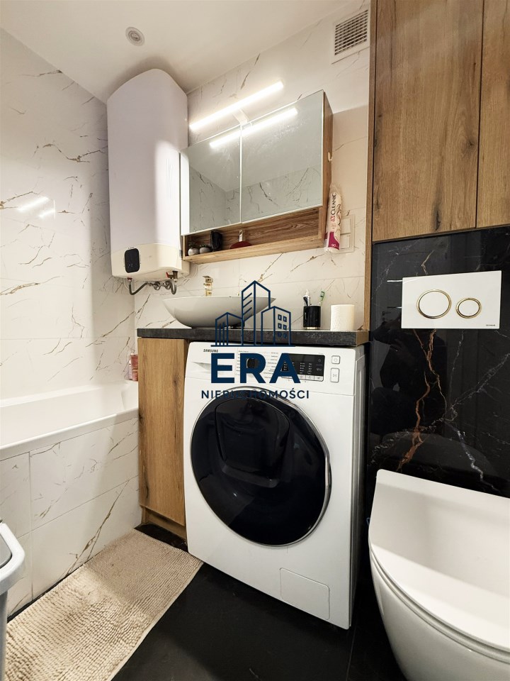 • Łazienka razem z wc, wyposażona w wannę oraz pralkę marki Samsung, glazura nowego typu;