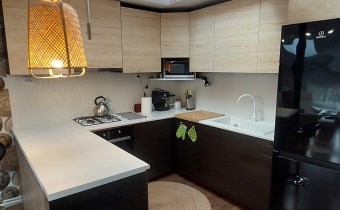 Składa się z: dużego salonu z otwartą kuchnią kompleksowo urządzoną i wyposażoną, dwóch sypialni, dużej łazienki z wanną i kabiną prysznicową, toaletą i pralką.