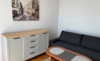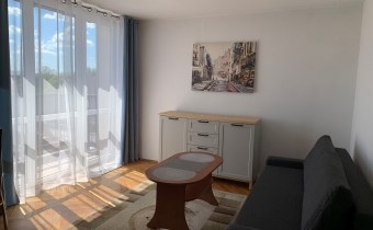 - salon z wyjściem na balkon, rozkładaną sofą, ława, mały dywan, komoda, szafa, stół, 4 x krzesło,