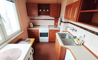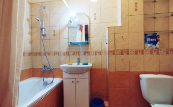Wykończenie i umeblowanie mieszkania: Pokój - podłogi PCV, ściany gładź+malowane. Rozkładana wersalka, regał, komoda, biurko, stolik Kuchnia - podłoga PCV, na ścianach glazura. Szafki kuchenne, lodówka, pralka, kuchnia gazowa z piekarnikiem, stolik, taboret, naczynia, sztućce, garnki itp Łazienka z wc - glazura, terakota. Wanna, umywalka z szafką, wc Przedpokój - podłoga PCV, Szafa
