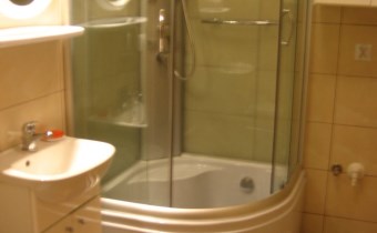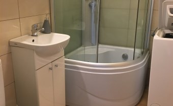 Pokój: podłoga: panele + dywan; okna: PCV, firanki, Meble: kanapa, fotel, szafka pod RTV, Telewizor; regał, komoda, Łazienka: po generalnym remoncie : glazura, terakota, natrysk, umywalka,