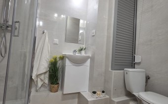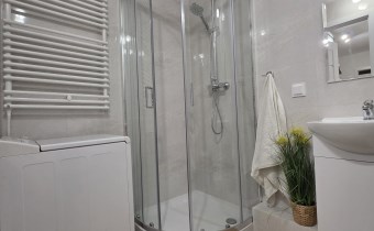 W łazience znajduje się umywalka, wc stojące, prysznic i pralka