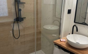 Wyposażenie łazienki kabina prysznicowa, lustro, natrysk, pralka, prysznic, umywalka
