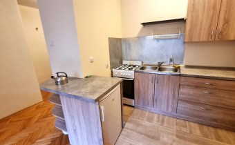- I POKÓJ: z aneksem kuchennym ok. 18 m kw, podłoga parkiet po cyklinowaniu, ściany gładzie gipsowe, malowane, kanapa, regał ,