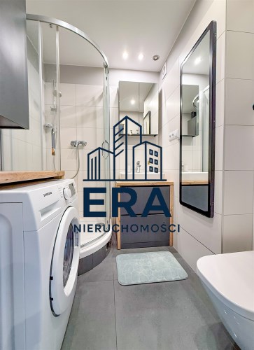 Łazienka w nowoczesnych barwach z dużą kabiną prysznicową, dodatkowo wyposażona w pralkę.