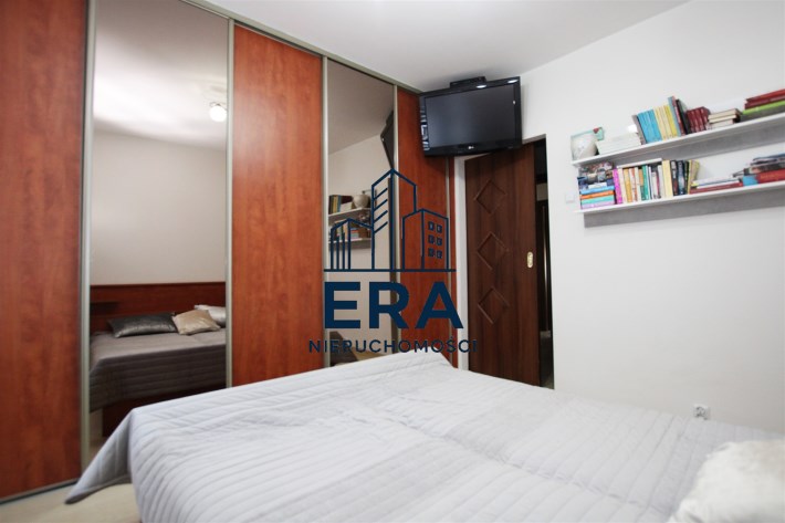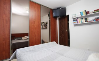 W pierwszej sypialni pojemna szafa w zabudowie typu komandor, łóżko sypialniane wraz ze stolikami nocnymi, półki i telewizor.