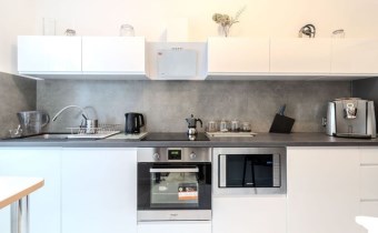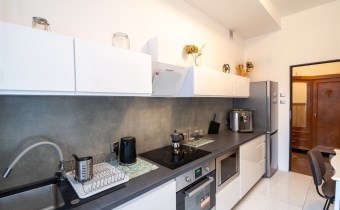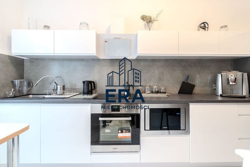 Pełne wyposażenie AGD: płyta indukcyjna, piekarnik, mikrofala, zmywarka, lodówka z zamrażarką,