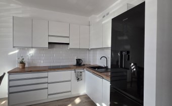 W kuchni znajduje się nowoczesna zabudowa wraz z pełnym wyposażeniem: płyta indukcyjna, zmywarka, lodówka, okap – wszystko utrzymane w spójnej, eleganckiej stylistyce.