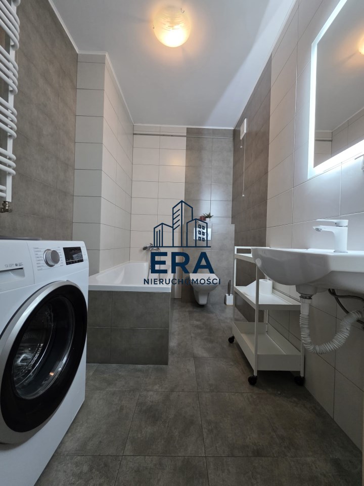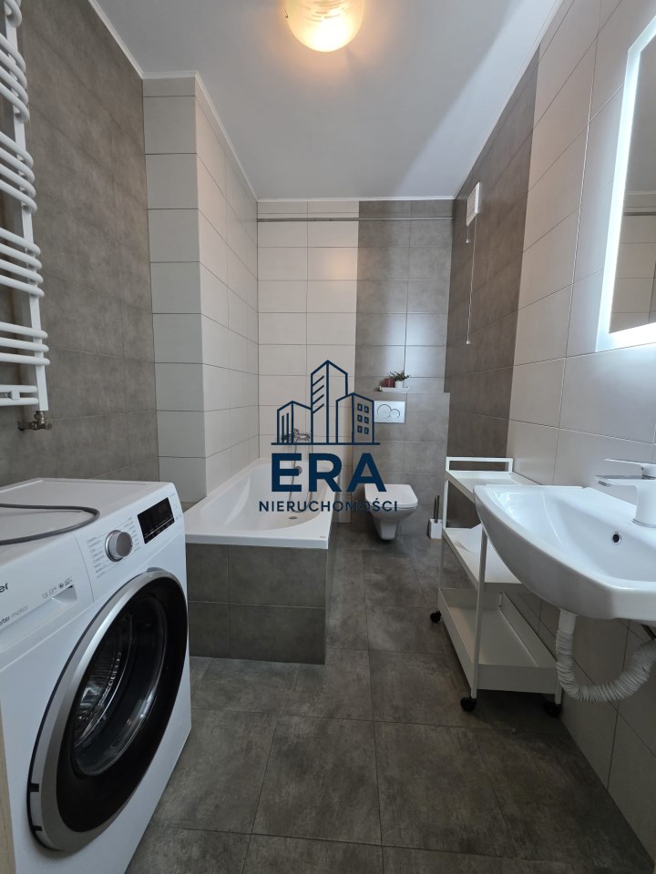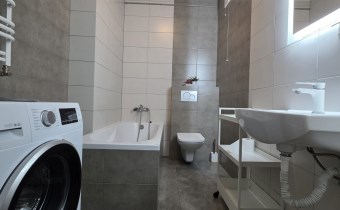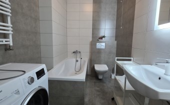 Łazienka wyposażona w wannę, umywalkę z szafką, wc podwieszane, pralkę oraz lustro.